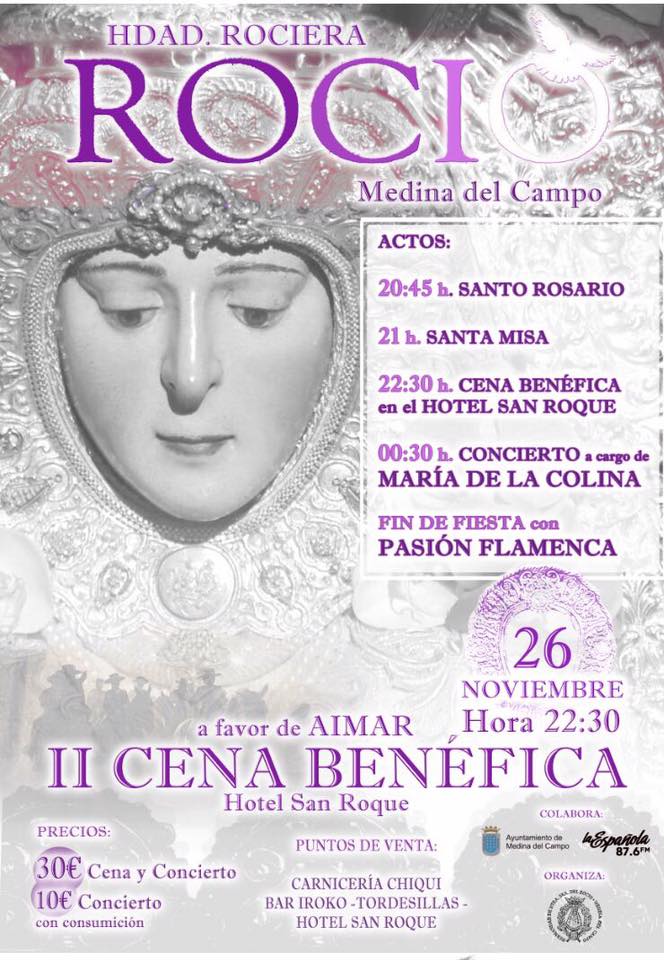 El sábado 26 de noviembre de 2016, coincidiendo con la Sabatina de dicho mes, se va a realizar la II CENA BENÉFICA en el Hotel San Roque. Al igual que el año pasado una vez concluida la cena habrá un concierto, en esta ocasión nos van a acompañar María de la Colina y Pasión Flamenca, el dinero recaudado ira destinado a» Aimar el niño de Tordesillas «.
