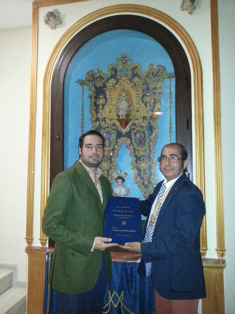 En la tarde del pasado 21 de Abril y a la conclusión del rezo del Santo Rosario que mensualmente se celebra cada tercer lunes de mes en la Parroquia de Ntra. Sra. de los Ángeles y San José de Calasanz y a las plantas del Bendito Simpecado la Hermandad de Ntra. Sra. del Rocío de Montequinto hizo entrega de las pastas conmemorativas que albergarán el pregón que el próximo día 17 de Mayo pronunciará el querido hermano de esta Corporación D. Juan Carlos Galán Portillo.