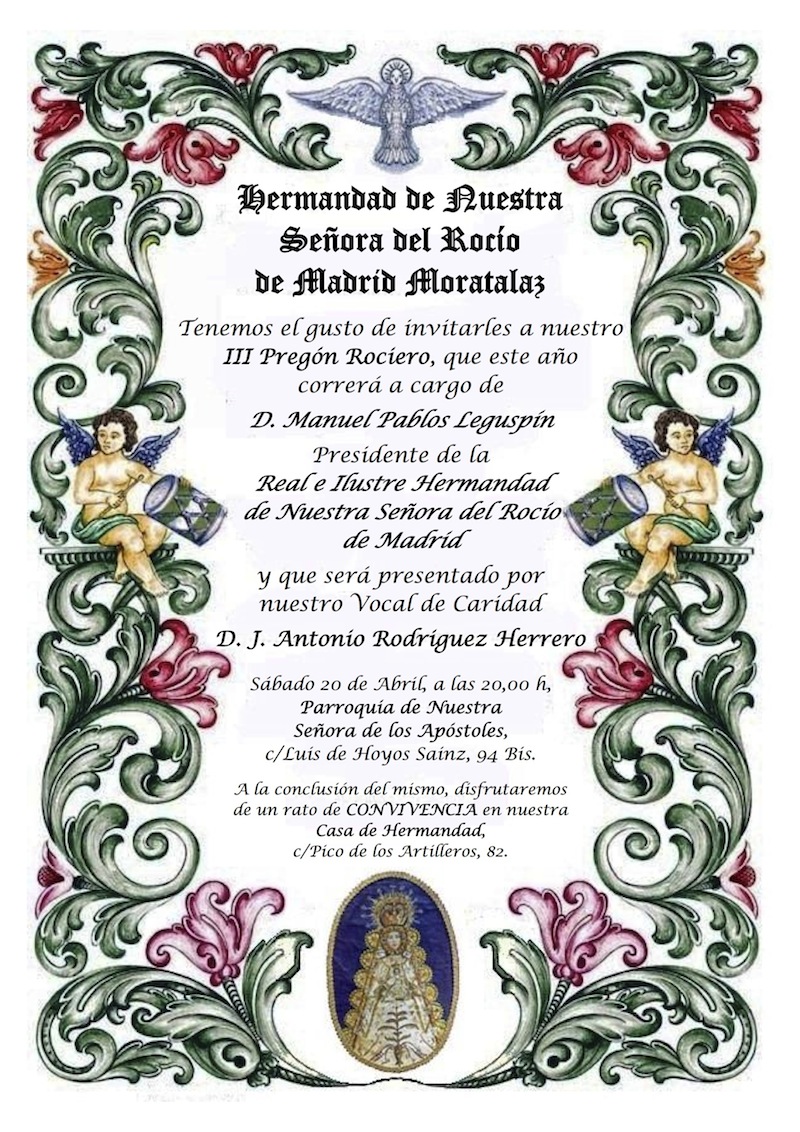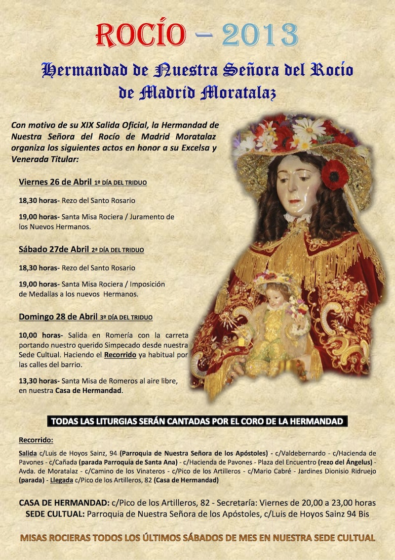 Hdad. de Moratalaz – Con motivo de su XIX Salida Oficial, la Hermandad de Nuestra Señora del Rocío de Madrid Moratalaz organiza los siguientes actos en honor a su Excelsa y Venerada Titular: