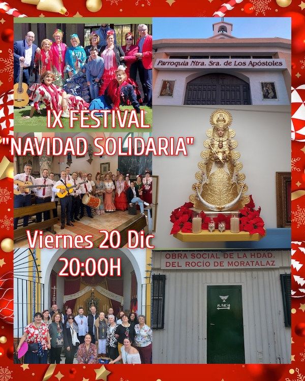 Solidaridad, compromiso, colaboración, caridad, en definitiva, amor al prójimo, son valores que todo cristiano y rociero han de tener presentes en su vida. Es por ello, que desde nuestra Hermandad de Moratalaz damos testimonio de ese Rocío de Caridad todo el año y os pedimos difusión y colaboración para este Festival.