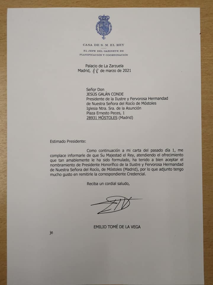 La Casa Real ha aceptado el nombramiento como Presidente Honorífico de la Hdad. a Su Majestad el Rey Felipe VI