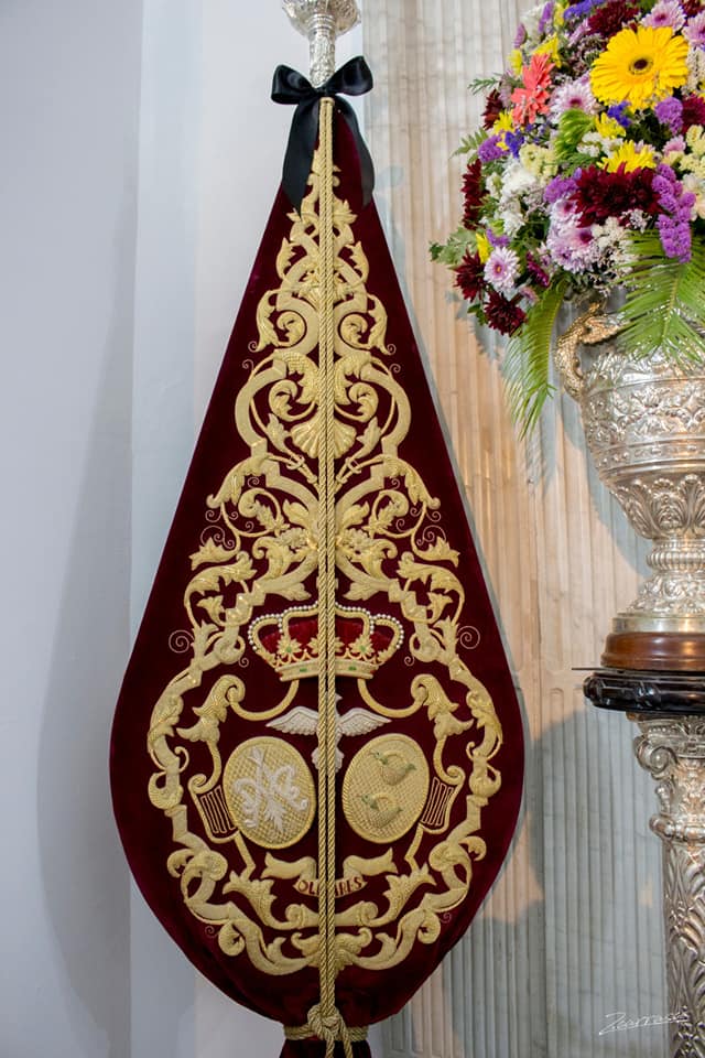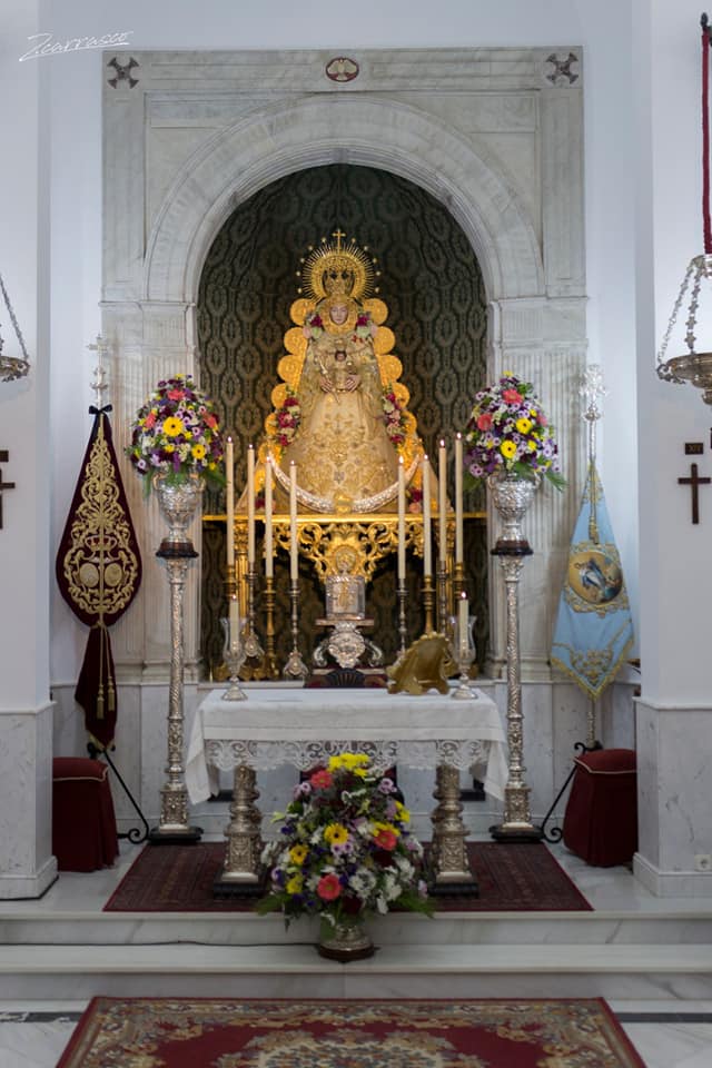 Se completa el altar central con 8 puntos de luz, bandera de la Inmaculada Concepción y el estandarte de la hermandad que luce crespón negro en memoria de los fallecidos por la pandemia del Covid-19. Sobre las antiguas columnas de nuestra anterior carreta lucen las jarras de la carreta actual.