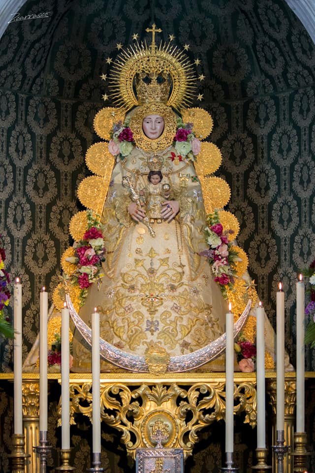 La imagen de la Santísima Virgen del Rocío presenta sus galas de reina para este triduo compuesta por :