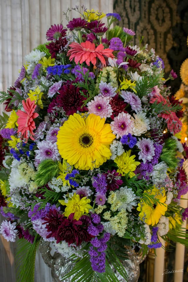 Exorno floral: Crisantemos euro de color amarillo, blanco y lila, statice amarillo, blanco y lila, gerberas, gypsy verde, Limonium rosa verdes varios.