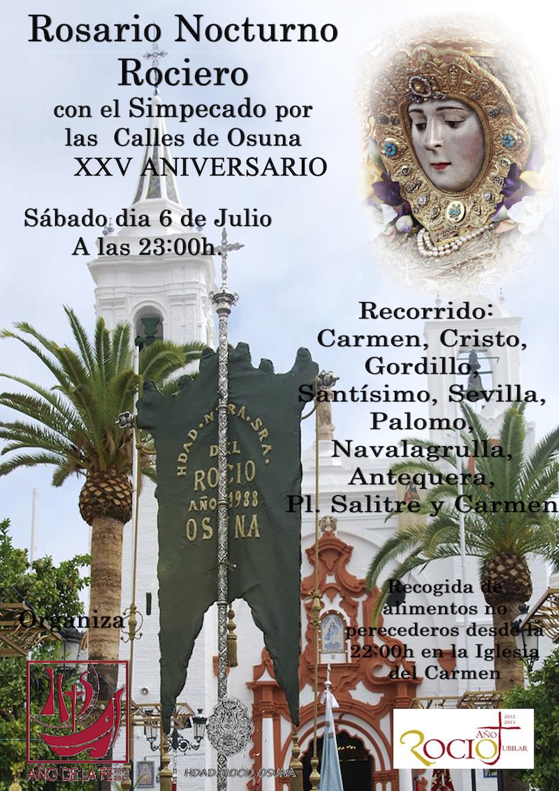 El próximo sábado 6 de Julio, la Hermandad de Ntra. Sra. del Rocío de Osuna hará historia realizando así el primer ROSARIO NOCTURNO por las calles de Osuna. Dicho Rosario dará comienzo a las 23:00 H., desde la iglesia del Carmen.