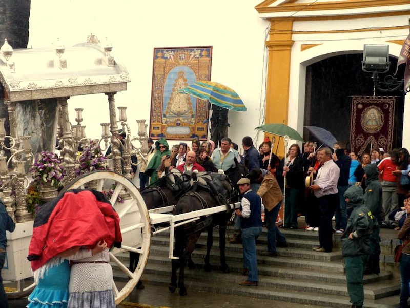 Continuábamos nuestro camino. Un camino del viernes que recuperábamos tras más de 15 años, entrando en el pueblo rociero de Villamanrique. Una entrada que si detallamos el recibimiento y la alegría nuestra es digna de recordar, si recordamos la meteorología, es digna de olvidar. Una inmensa tromba de agua donde no se podía ver a más de 10 metros por la cantidad de agua que caía, nos bañaba justo cuando encaramos a la Parroquia del pueblo, lugar de paso de tantas y tantas Hermandades rocieras. Una tromba de agua que pilló desde el más jóven de la Hermandad, hasta el más anciano, pasando por nuestro capellán, el hermano mayor y hasta la alcaldesa de Villamanrique que permaneció intacta durante todo el tiempo que se cantaba la Salve.