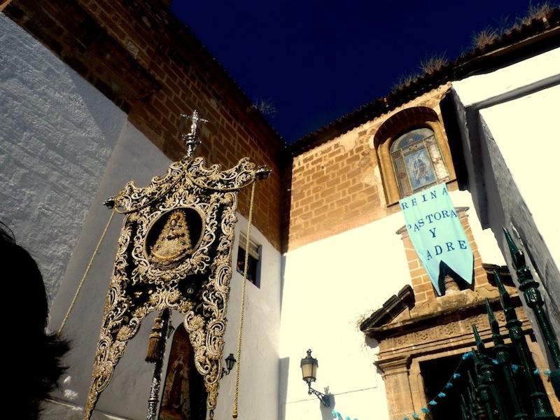 Flores de papel, romero en el suelo, macetas en las puertas, cuadros de la Virgen, todo cuanto fuese necesario para recibir el Simpecado de la Virgen del Rocío.