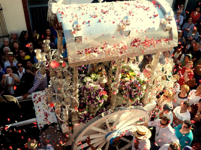 Al término de la Santa Eucaristía presidida y predicada por el inseparable carmelita de la Hermandad, Fray Manuel Jurado Perea, esperaba la carreta del Simpecado para su posterior entronización, exornada por Statics en tonos morados, lila y blancos y margaritas blancas. Una Eucaristía que estuvo amenizada por el Coro Ahava y un grupo de tamborileros de la Pastora de Cantillana, los cuáles fueron reconocidos durante la Misa.