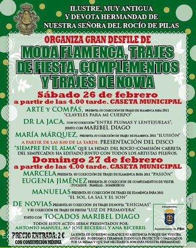 Durante los días 26 y 27 de febrero tendrá lugar el Gran Desfile de Moda Flamenca, Trajes de Fiesta, Complementos y Trajes de novia, que ha organizado la Hermandad de Nuestra Señora del Rocío de Pilas, y cuyos beneficios estarán destinados a la restauración de la Carreta y del Simpecado.