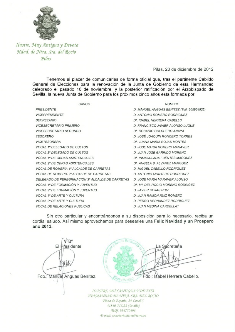 La ILUSTRE, MUY ANTIGUA Y DEVOTA HERMANDAD DE NUESTRA SEÑORA DEL ROCIO DE PILAS tiene nueva Junta de Gobierno que preside D. Manuel Anguas Bénitez