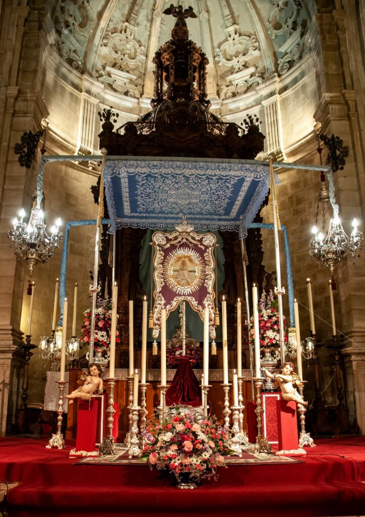Se construye un palio partiendo de cuatro varas de plata meneces (cedidas por la Hermandad de Padre Jesús de Ronda) pertenecientes al conjunto de procesiona la Virgen de los Dolores cada Viernes Santo,así como los cordones en fleco de bellota que tan característico compás aportan a dicho palio, una pieza de antiguo encaje bordado da forma al techo y las bambalinas en color azul cielo bordado en blanco roto color representativo de la Hermandad Matriz y al Inmaculado Corazón de María, en los estremos y siguiendo con la similitud a un paso de palio dos lámparas de araña en cristal de roca y con tulipas talladas de guardabrisas hacen las veces de Candelaria de cola,al igual que otras dos arañas en color gris espejado dan luz a la delantera del palio como lo haría un gran trono Malagueño. Cuanto ánforas de plata con exorno floral k suele acompañar a nuestra dolorosa de referencia siguen completando dicho altar( clavel,clavel mini, margarita, clavel del poeta,alelies,limonium, flor de cera, eucalipto redondo y verde magnolio) todo ello custodiado por blandones de plata, y para centrar el conjunto nuestro Glorioso Simpecado precedido por un juego de candelaria que dan el toque identificativo a un paso»Mariano»donde se a querido captar la atención de hermanos y el pueblo de Ronda.