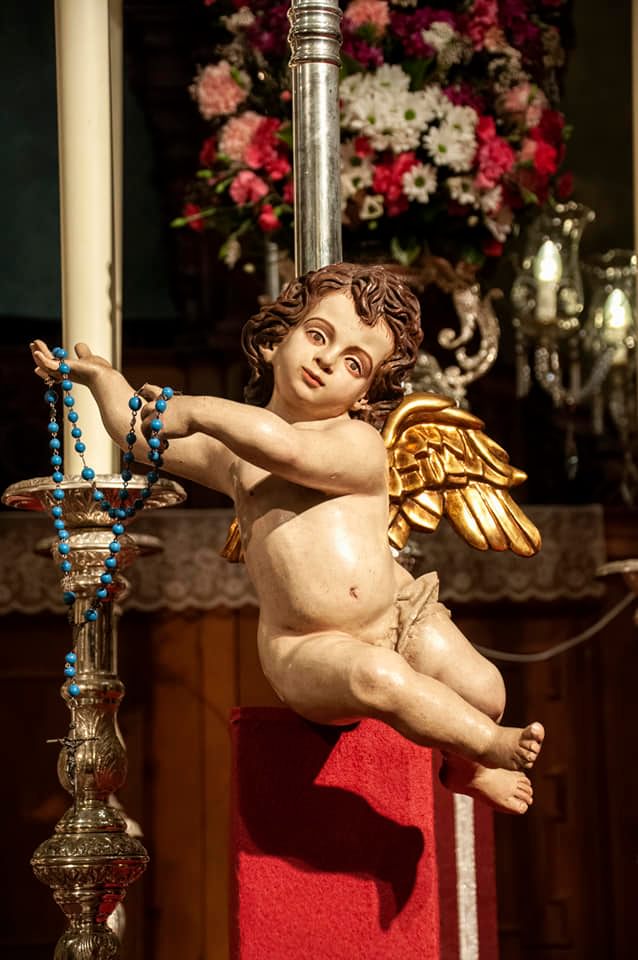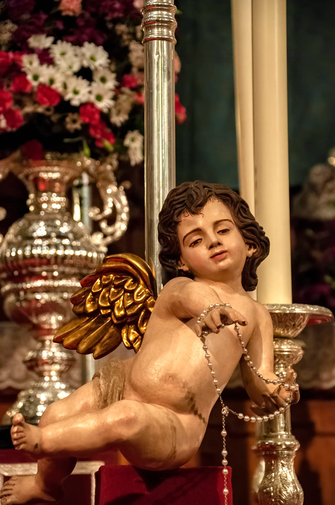 Dos querubines alados con sendos rosarios en las manos nos ofrecen las oraciones y plegarias que los rocieros íntimamente compartimos con la Santísima Virgen.