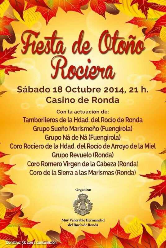El próximo Sábado 18 de Octubre, a las 21.00 horas en el Casino de Ronda, celebraremos nuestra Anual Fiesta Rociera. Ven con nosotros y pasa una agradable velada rociera.