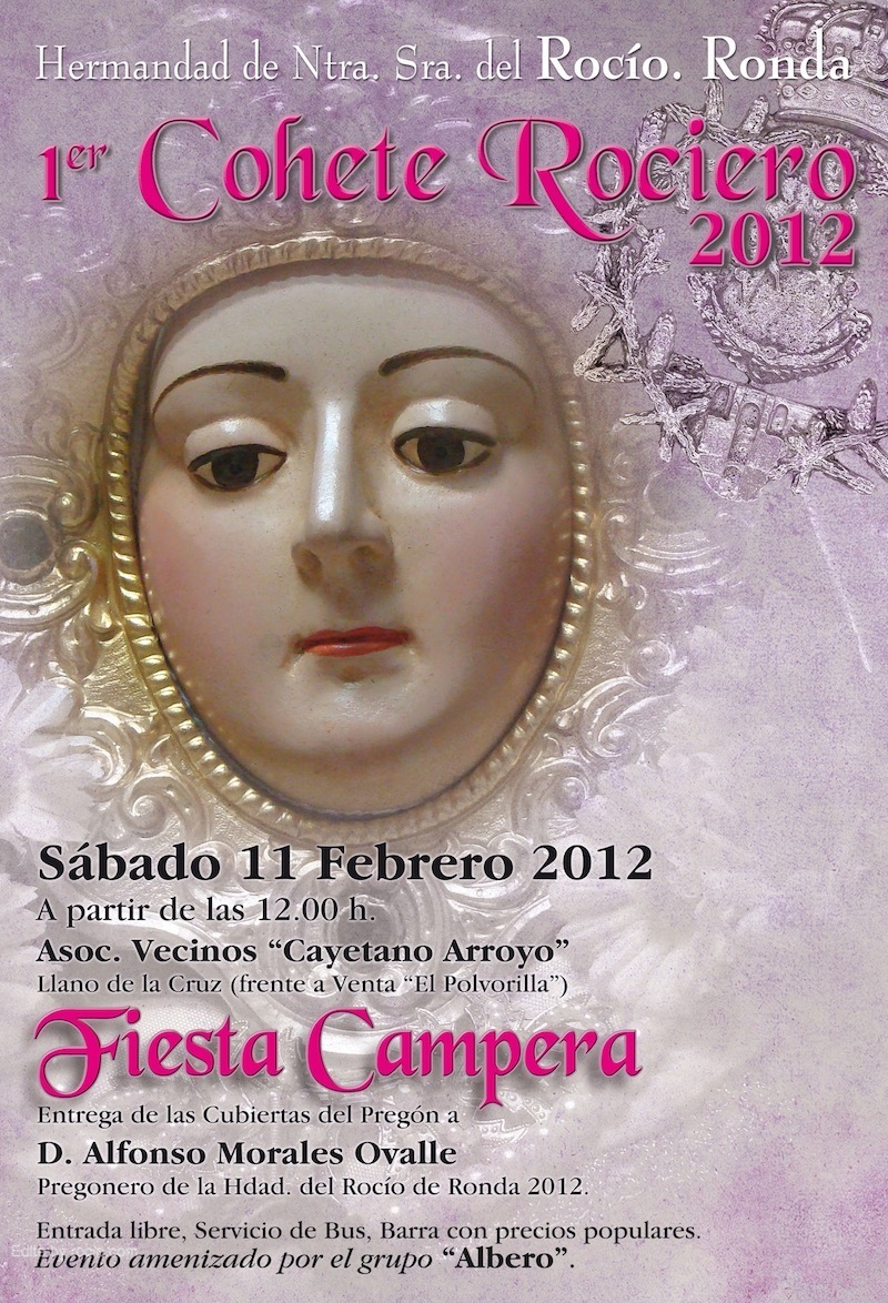Recordaros, que para el Sábado 11 de Febrero de 2012 estamos organizando el I Cohete Rociero 2012, donde se hara entrega de las cubiertas del pregón a D. Alfonso Morales Ovalle, pregonero de la Hdad. del Rocío de Ronda 2012. La entrada es libre, tendremos servicio de autobús, barra con precios populares y todo amenizado por el grupo «Albero». Adjunto cartel anunciador del evento.