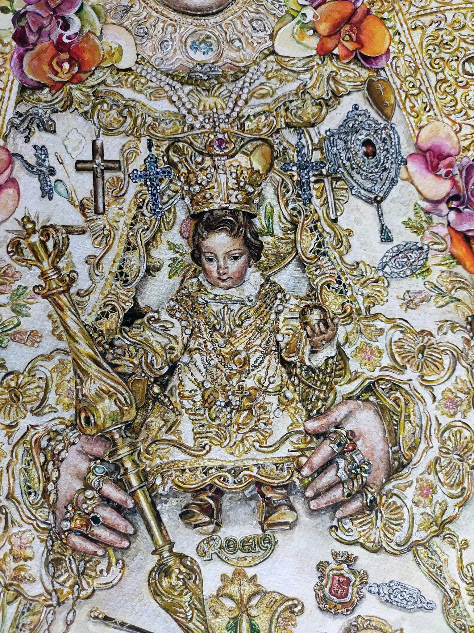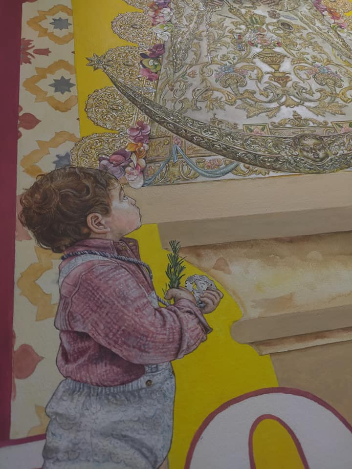 Por último, nos encontramos dos figuras que aparecen junto a la virgen, y que nos podrían recordar a aquellas estampas en blanco y negro de la virgen en Almonte rodeada de los suyos. Un pequeño con su Madre, semilla del Rocío: Manuel le entrega a la virgen romero mientras juega con su medalla; Todos nos podemos sentir identificados con este niño, porque de una forma u otra, desde pequeños todos hemos sentido presente a la virgen del Rocío. Este niño nos habla de nosotros, de nuestra relación con ella, y también nos habla de que nuestras tradiciones tienen futuro. Como dijo el sacerdote rondeño Gonzalo Huesa en 2003: “Ronda se ha ganado a pulso el título de ciudad mariana”; nuestras tradiciones marianas tienen ,pues, futuro, aunque se vean politizadas, despreciadas, o ridiculizadas…