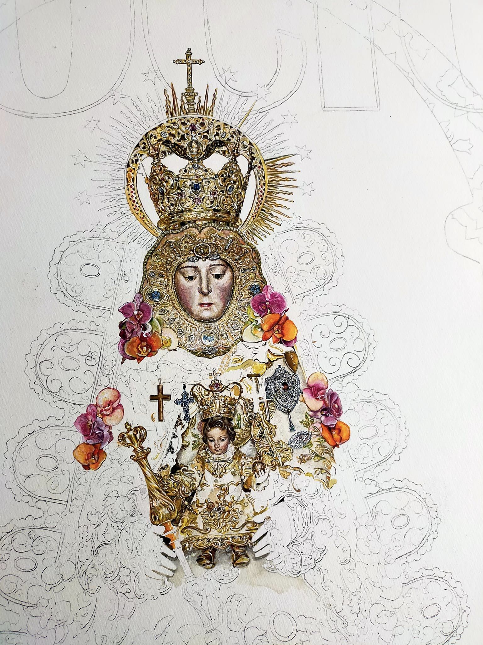 Cuando la junta se pone en contacto conmigo para anunciarme que iba a ser cartelista, no se me quitaba de la cabeza aquella primera sevillana que escuché de niño: “Tol´mundo tiene una madre, y yo sin embargo dos”, ¡Cuantas discusiones me ha llevado esta verdad con la mía!. Este cartel es un alarde a la maternidad terrena y celeste.