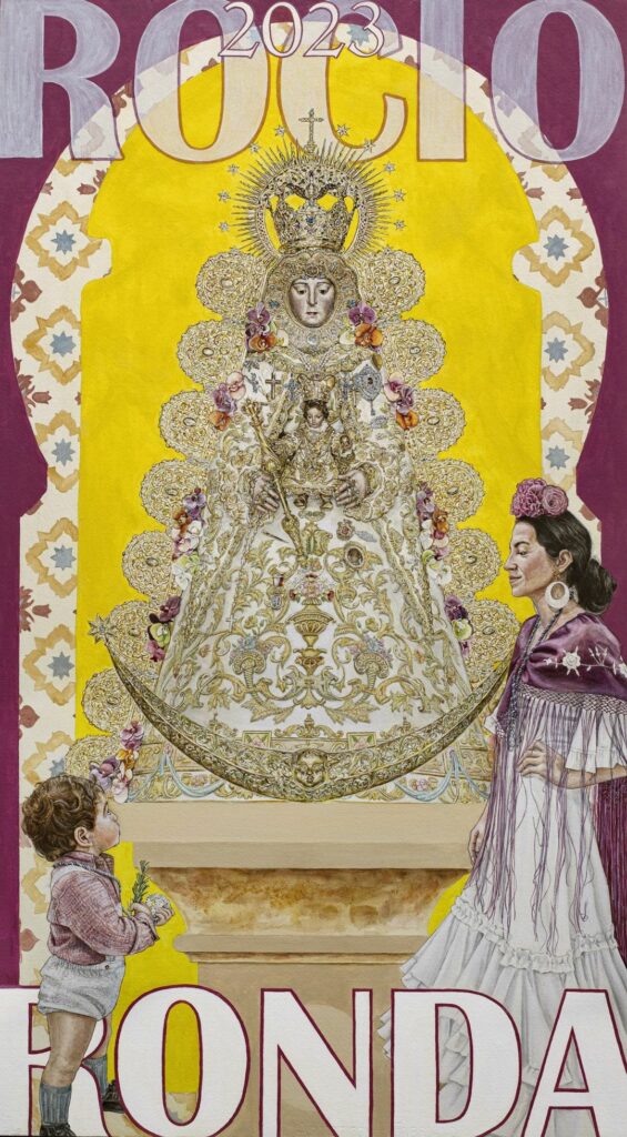 Un escalofrío -Como cantan los marismeños- recorre el cuerpo cuando te plantean algo así. Pintar este cartel suponía tres retos: Hablar del Rocío a Ronda, hablar de Ronda a los rondeños, y hablar de Ronda al Rocío; Nada fácil.