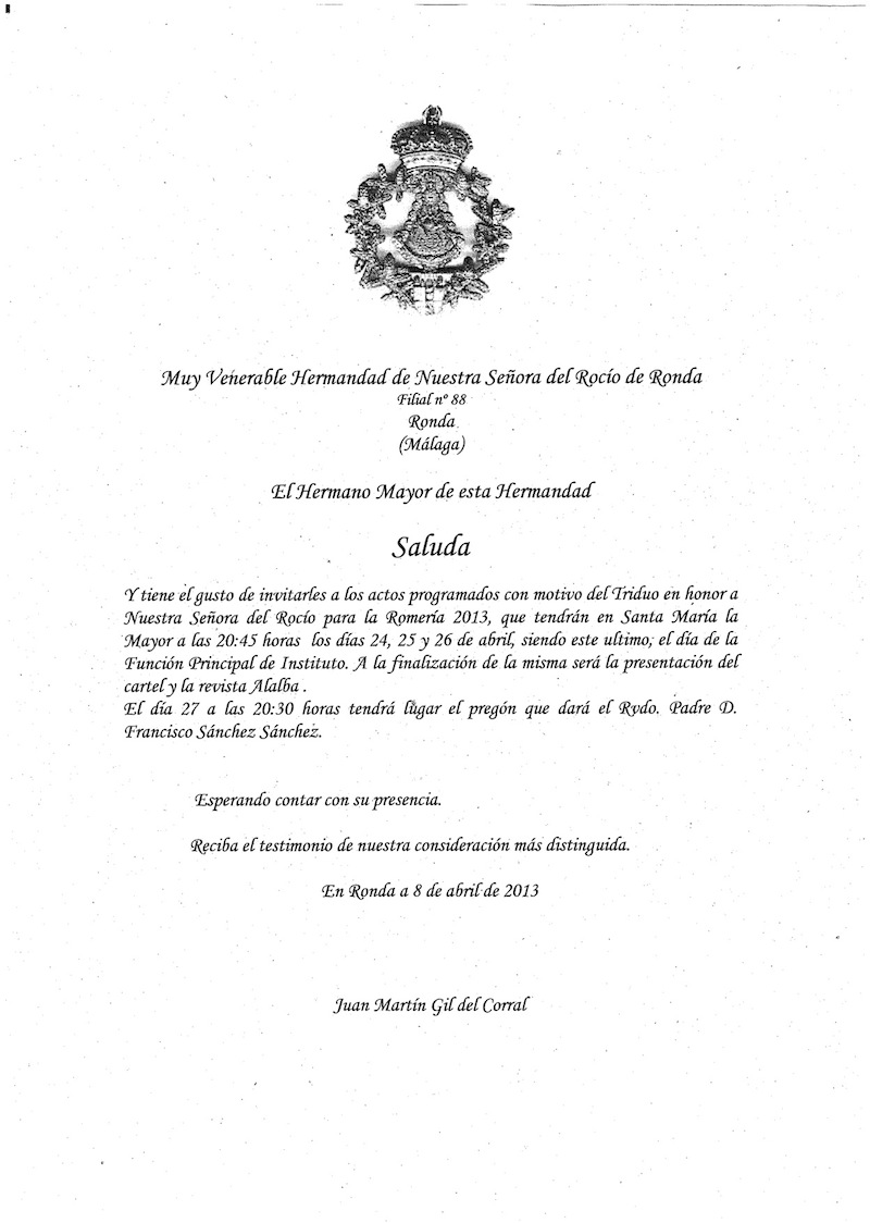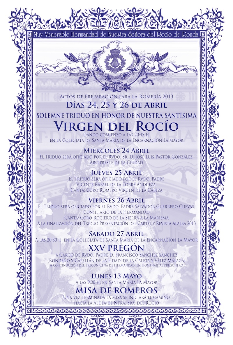 La Hdad. de Ronda os invita al Solemne Triduo preparatorio de la Romería 2013 en honor de Ntra. Sra. del Rocío y al Pregón rociero que se celebrará el sábado 27 de abril.