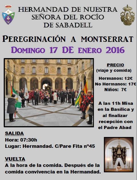 Este próximo domingo 17 de enero de 2016 la Hermandad De Ntra Sra Del Rocío De Sabadell realizará su XXII Peregrinación al Santuario de Montserrat.
