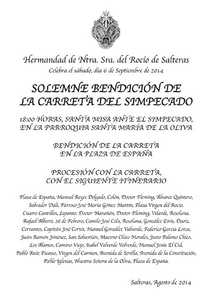 La Hermandad de Salteras procederá a la  Solemne bendición de la carreta del Simpecado el próximo 6 de septiembre de 2014.