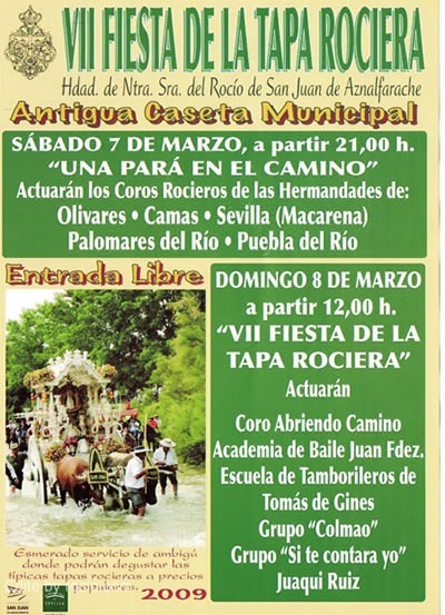 Durante los dias 7 y 8 de Marzo, se celebrará la Fiesta de la Tapa Rociera, teniendo lugar la misma en la antigua caseta municipal. El Sabado 7 de Marzo a partir de las nueve de la noche «Una Pará en el camino»,actuando los coros de las Hermandades de Ntra. Sra. del Rocio de Olivares ,Sevilla (Macarena),Palomares del Rio y Puebla del Rio. El domingo 8 de Marzo, apartir de las doce de la mañana, comenzaran los actos de la Fiesta de la Tapa, en la que intervendran los siguente artistas:Coro Abriendo Camino,escuela de baile de Juan Fernaddez, ,Grupo Colmao,Grupo «Si te contara yo», Juaqui Ruiz,Sal y Pientaentre otros.