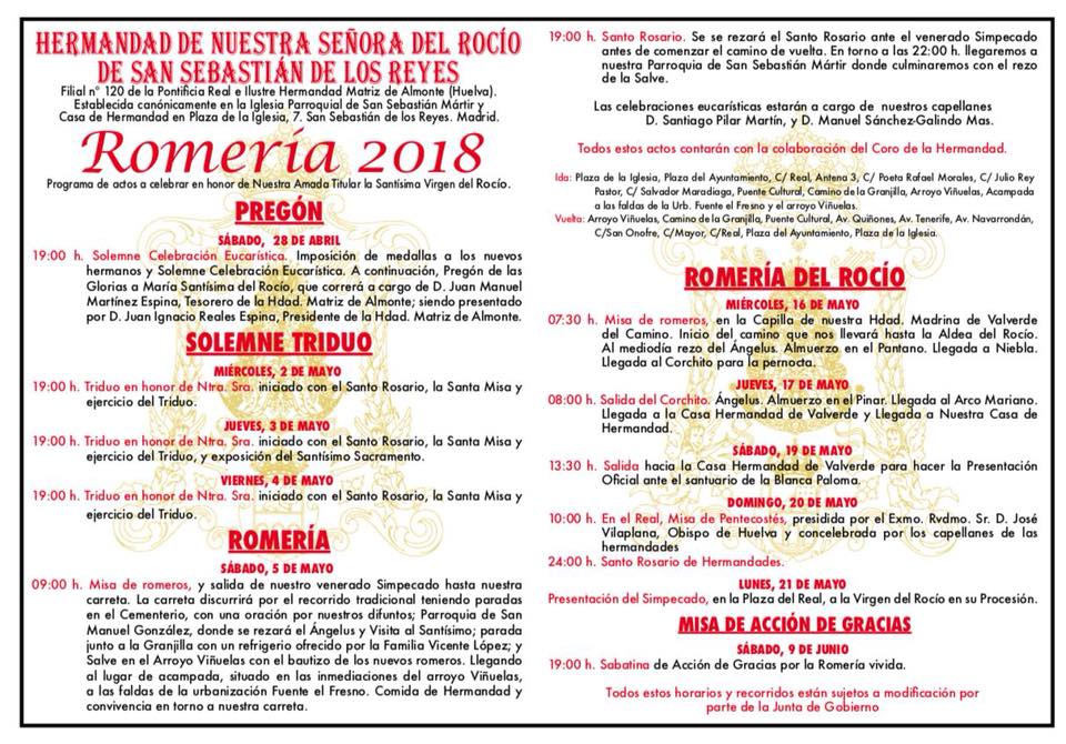 Hermandad de San Sebastián de los Reyes – Actos y Cultos para la Romería de 2018
