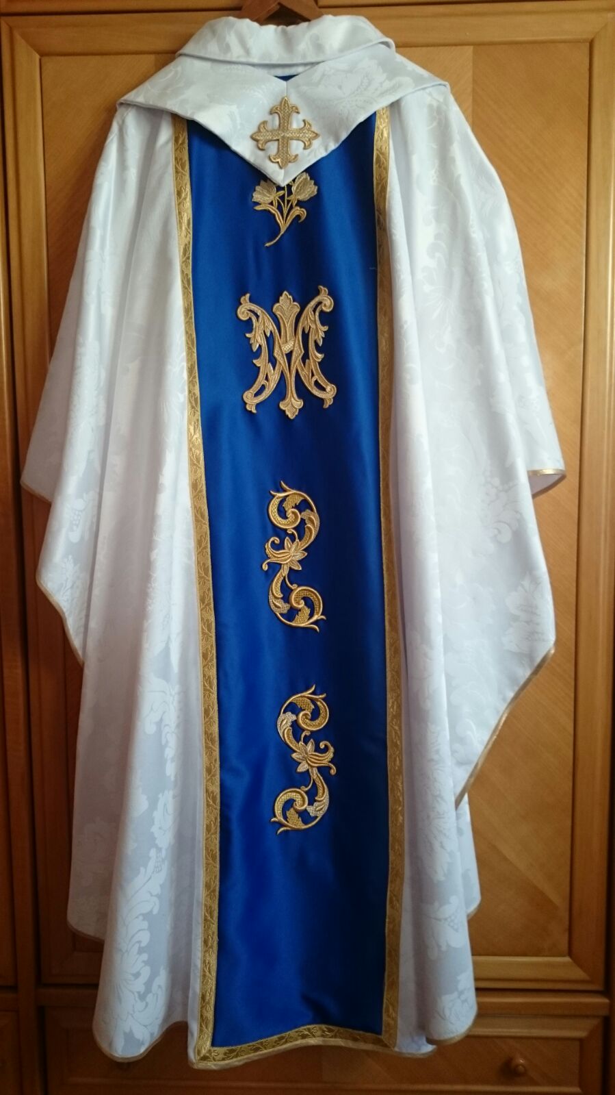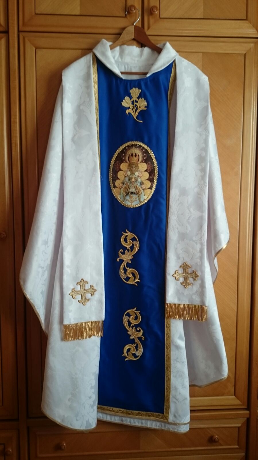 Casulla y estola realizado por el Taller de la Hdad. «Costureras de la Virgen» confeccionada en tela adamascada blanca y su franja en azul rey con aplicaciones: en su anverso lleva como imagen central un oleo con la imagen de la Virgen y en el reverso el anagrama «Ave Maria».