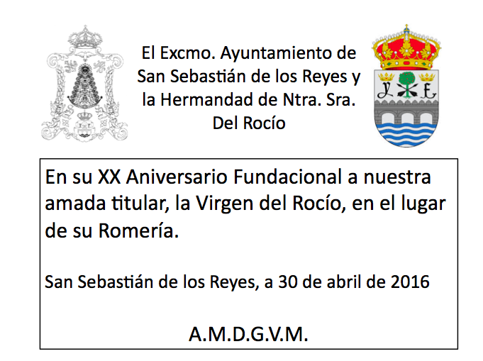 El pasado 5 de noviembre se recibió la resolución y aprobación, por parte del Excmo. Ayuntamiento de San Sebastián de los Reyes y de la Consejería de Medio Ambiente, Administración Local y Ordenación del territorio de la Comunidad de Madrid; de la colocación de una placa conmemorativa, con motivo del XX Aniversario Fundacional de la Hermandad de Ntra. Sra. del Rocío de San Sebastián de los Reyes.