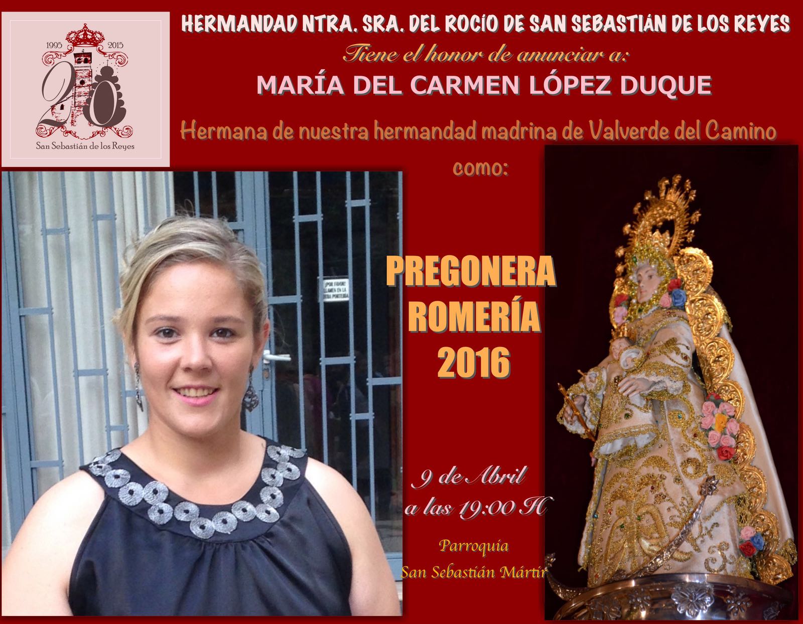 La Hermandad de Nuestra Señora del Rocío de San Sebastián de los Reyes tiene el honor de presentar como pregonera de las Glorias a María Santísima del Rocío, de este año 2016, a Doña María del Carmen López Duque, Hermana de nuestra Hermandad madrina de Valverde del Camino.