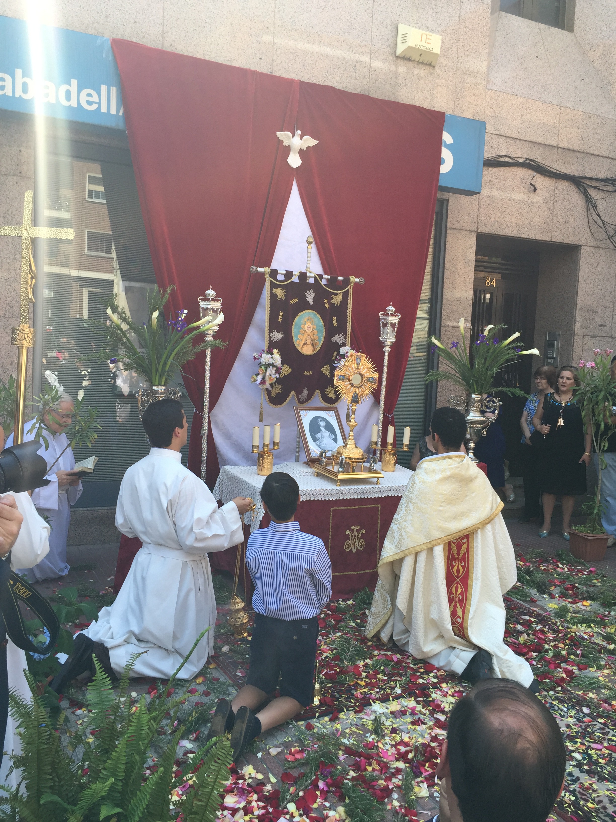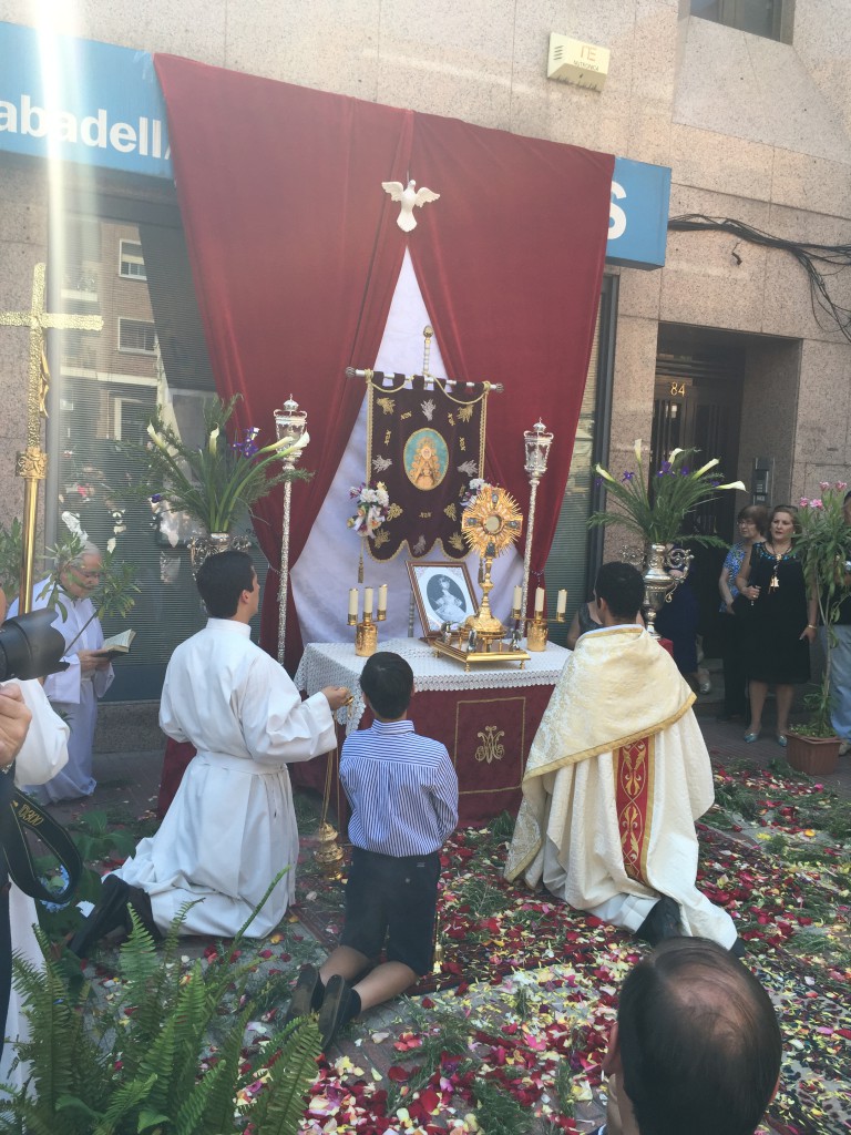 La Hermandad del Rocío de San Sebastian de los Reyes participa por primera vez montando un altar con motivo de la fiesta del Corpus, engalanando para la ocasión su primitivo simpecado que después de muchos años ha vuelto a recorrer las calles del municipio.