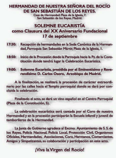 La Hermandad de San Sebastián de los Reyes celebra Solemne Eucaristía el sábado 17 de septiembre como Clausura de susActos de XX Aniversario Fundacional.