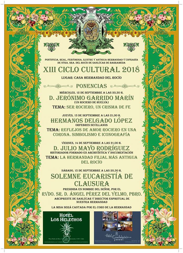 Hoy viernes 14 de Septiembre a las 21:00 horas en la Casa Hermandad del Rocío de Sanlúcar, tendrá lugar una conferencia a cargo del historiador y archivero Julio Mayo Rodríguez bajo el título “La hermandad filial más antigua del Rocío”. Dicha conferencia se encuentra dentro del XIII Ciclo cultural organizado por la corporación sanluqueña.