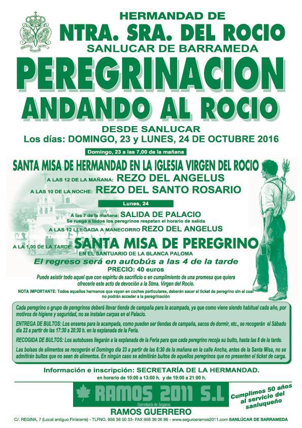 La Hermandad de Sanlúcar de Barrameda organiza una Peregrinación Andando al Rocío el próximo 23 de octubre de 2016 con salida el lunes 24.