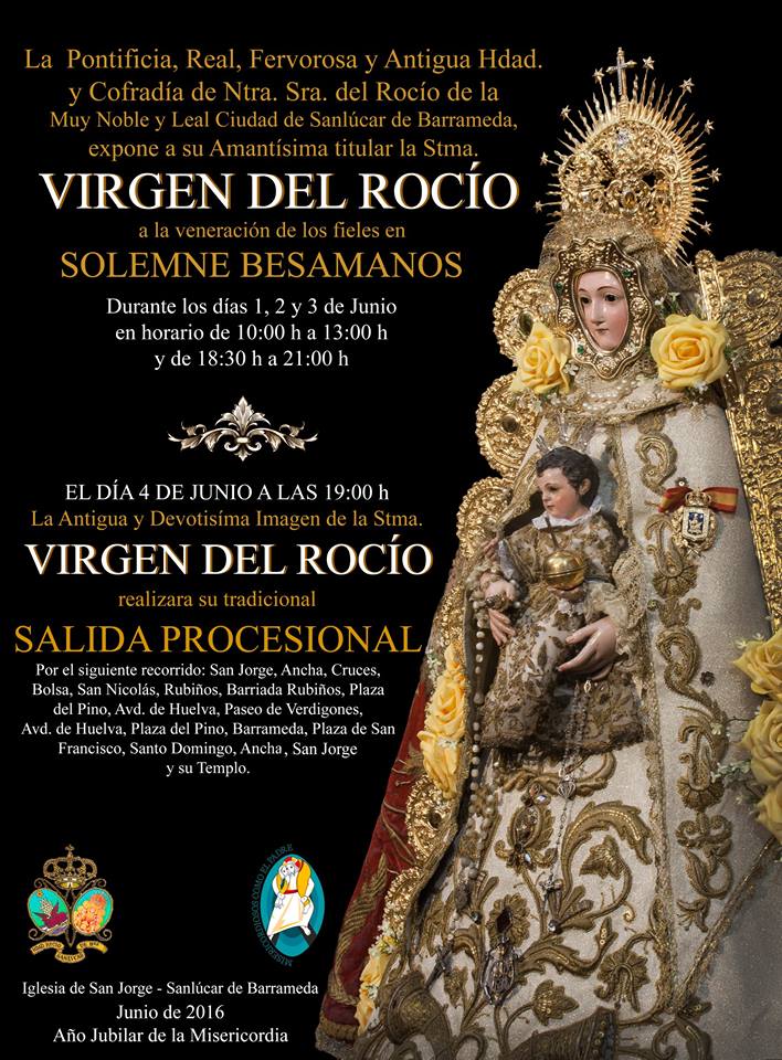 La Hermandad de Sanlúcar de Barrameda expone a su Santísima Titular al Solemne Besamanos durante los días 1,2 y 3 de junio de 2016 y celebra Salida Procesional el día 4 de junio.