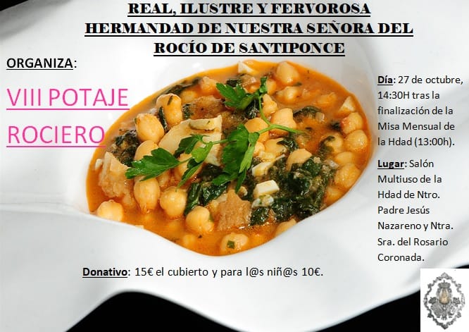 El sábado, día 27 de octubre a las 13’00 horas, celebraremos la Misa mensual en la Capilla. Tras esta, tendrá lugar el, ya tradicional, Potaje Rociero.