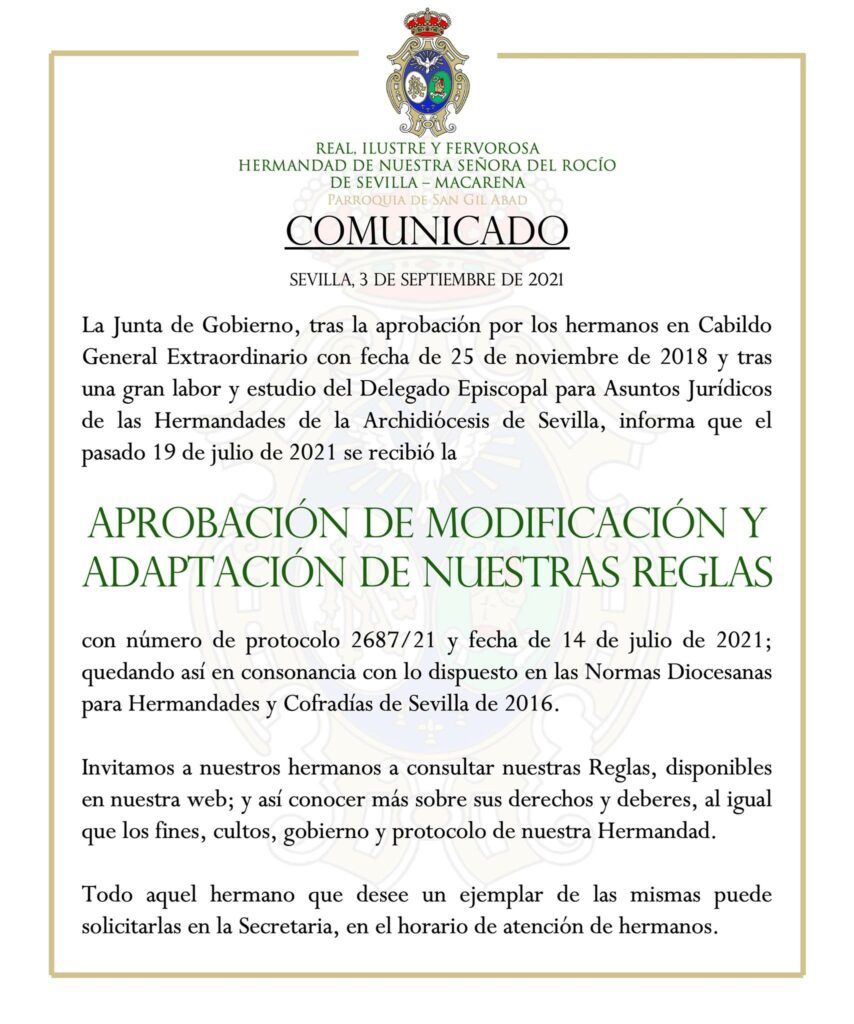 La Junta de Gobierno, tras la aprobación por los hermanos en Cabildo General Extraordinario con fecha de 25 de noviembre de 2018 y tras una gran labor y estudio del Delegado Episcopal para Asuntos Jurídicos de las Hermandades de la Archidiócesis de Sevilla, informa que el pasado 19 de julio de 2021 se recibió la aprobación de modificación y adaptación de nuestras Reglas, con número de protocolo 2687/21 y fecha de 14 de julio de 2021; quedando así en consonancia con lo dispuesto en las Normas Diocesanas para Hermandades y Cofradías de Sevilla de 2016.