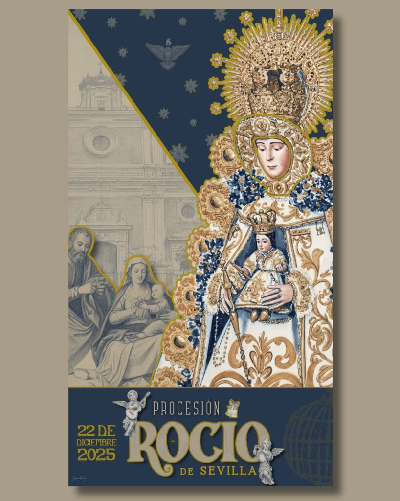 En la zona inferior, el nombre ROCÍO se presenta en una tipografía inspirada en los azulejos antiguos, flanqueada por dos ángeles —los mismos que coronan el simpecado titular—, aquí portando una pandereta y una guitarra como guiño a los villancicos que hacen única esta procesión. Como remate simbólico, aparece el bombo de la Lotería Nacional, evocando la fecha en la que celebramos esta cita tan especial.