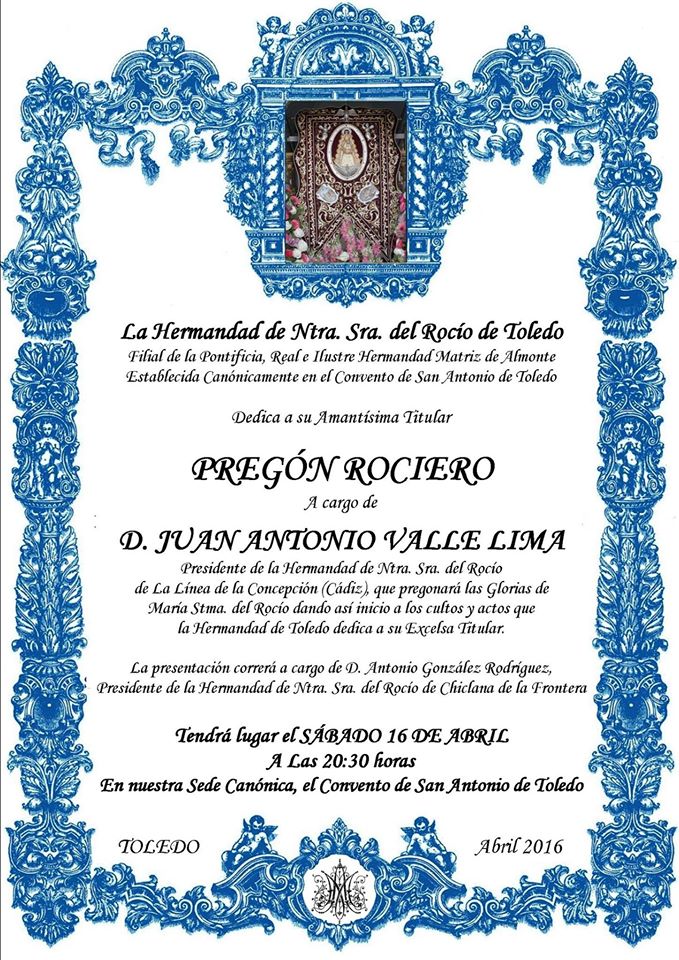 La Hermandad de Toledo celebra su  Pregón del Rocío a cargo de Juan Antonio Valle Lima el día 16 de abril de 2016.