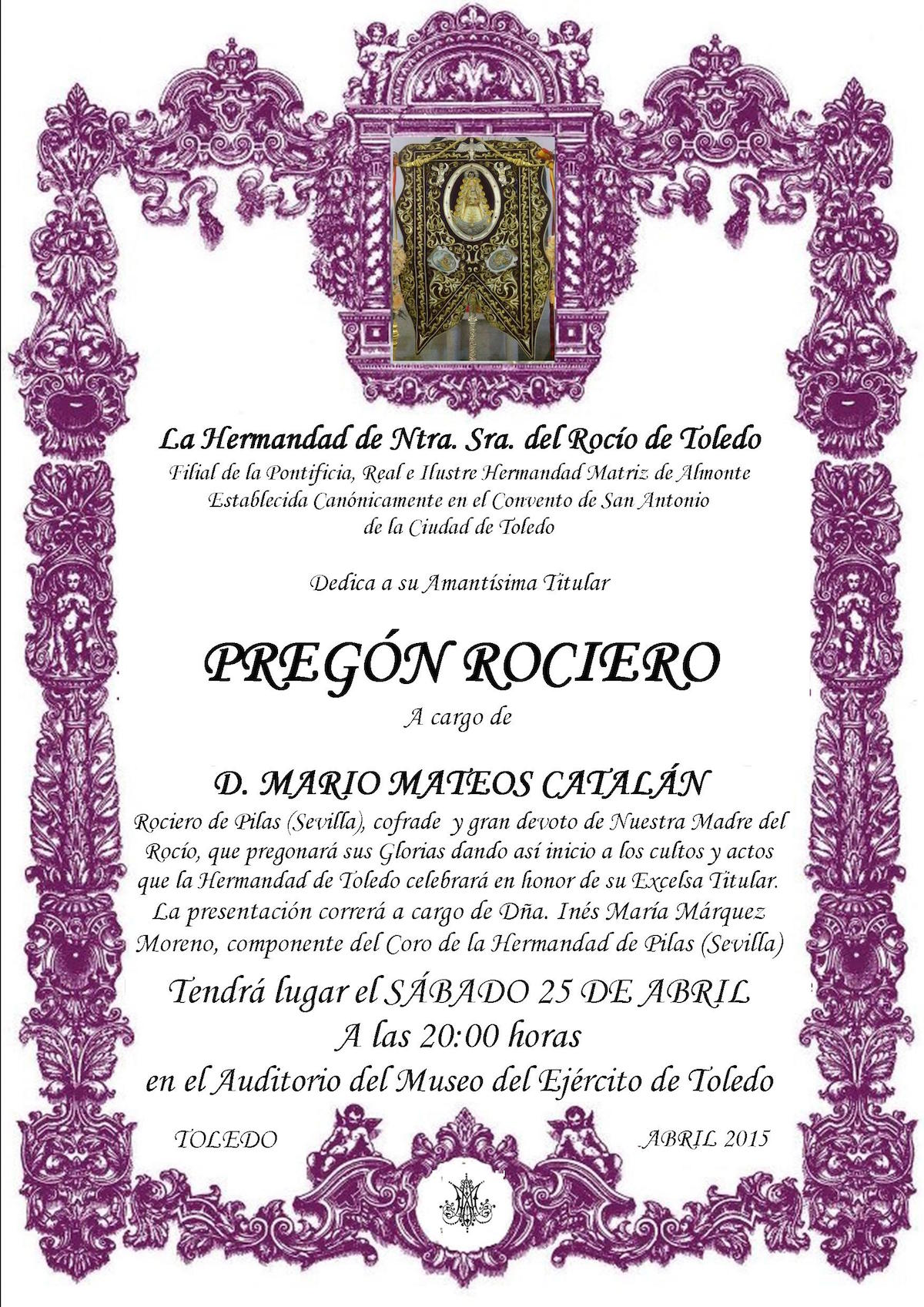 El próximo día 25 de abril, sábado, a las 20:00 horas en el Auditorio del Museo del Ejército de Toledo, tendrá lugar el PREGÓN ROCIERO de nuestra Hermandad. Será pronunciado por D. Mario Mateos Catalán, cofrade y rociero de Pilas (Sevilla). La presentación correrá a cargo de Dña. Inés María Márquez, componente del Coro de Pilas (Sevilla). Intervendrá el Coro de la Hermandad de Toledo, y la entrada será gratuita.