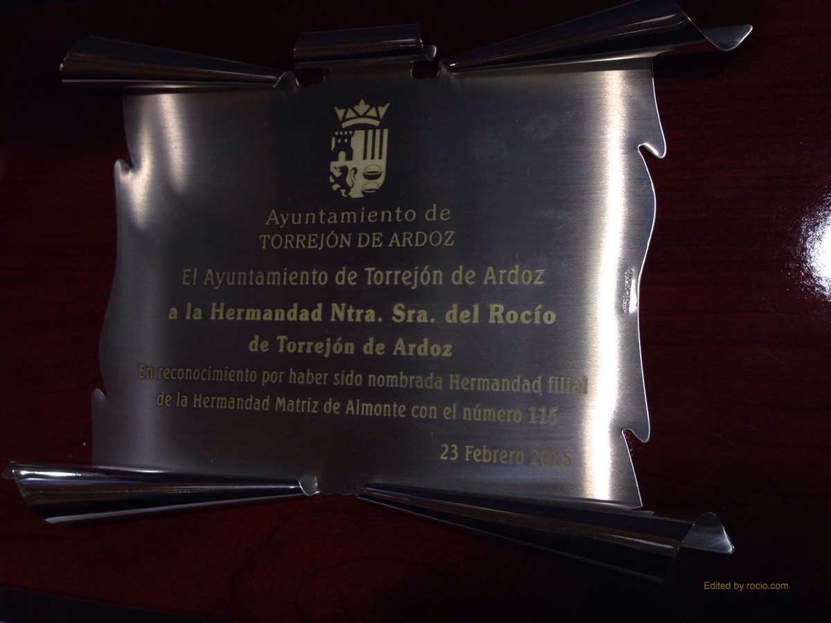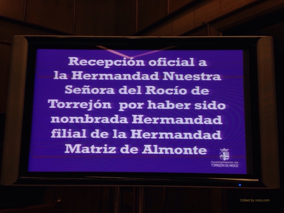 El lunes 23 de febrero, el Excmo. Ayuntamiento de Torrejón de Ardoz celebró una Recepción Oficial a la Hdad. del Rocío de Torrejón con motivo del nombramiento como nueva filial. El Sr. Alcalde dirigió unas emotivas palabras hacia la hermandad, recordando el momento en que acompañó a la hermandad el día del nombramiento en el Santuario del Rocío. Hizo entrega de una placa conmemorativa a la Hermandad. Después el Presidente le entregó a D. Pedro y a D. Valeriano un recuerdo del día que nos acompañaron a recoger el Título. Al acto también acudió una pequeña representación de los hermanos.