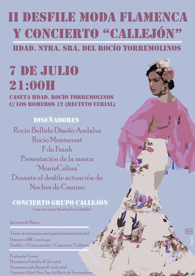 La Hermandad del Rocío de Torremolinos ha organizado para el próximo 7 de julio un Desfile de Moda Flamenca con diseños de “Rocío Bellido, Rocío Montserrat y F de Frank”. Además, durante el desfile, en el que participará el grupo “Noches de Camino”, se presentará la marca “MonteColina”. La Hermandad quiere apoyar una vez más la moda hecha en Málaga con diseñadores de nuestra provincia y de Torremolinos, como es el caso de la marca MonteColina, nacida en nuestra localidad.