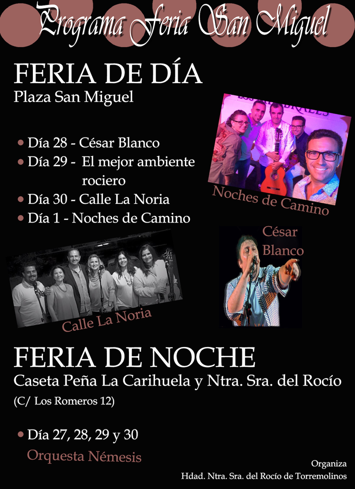 La Hermandad del Rocio de Torremolinos se prepara durante estos días para vivir la Feria en honor a su Patrón, San Miguel Arcángel. Como viene siendo habitual, la Hermandad colocará su tradicional barra en la Plaza San Miguel los días 28, 29, 30 de septiembre y 1 de octubre. Además, contará con comida a precios populares como paella, callos, montaditos, entre otros. Uno de los atractivos con los que cuenta cada año la Hermandad Torremolinense es que ofrecen el mejor ambiente de feria con actuaciones en directo. El día 28 amenizará la “Feria de Día” César Blanco, con versiones de los años 70 y 80. El sábado día 30 cantará el grupo Calle la Noria y el domingo día 1 de octubre será el turno del grupo Noches de Camino, muy ligado a esta Hermandad.