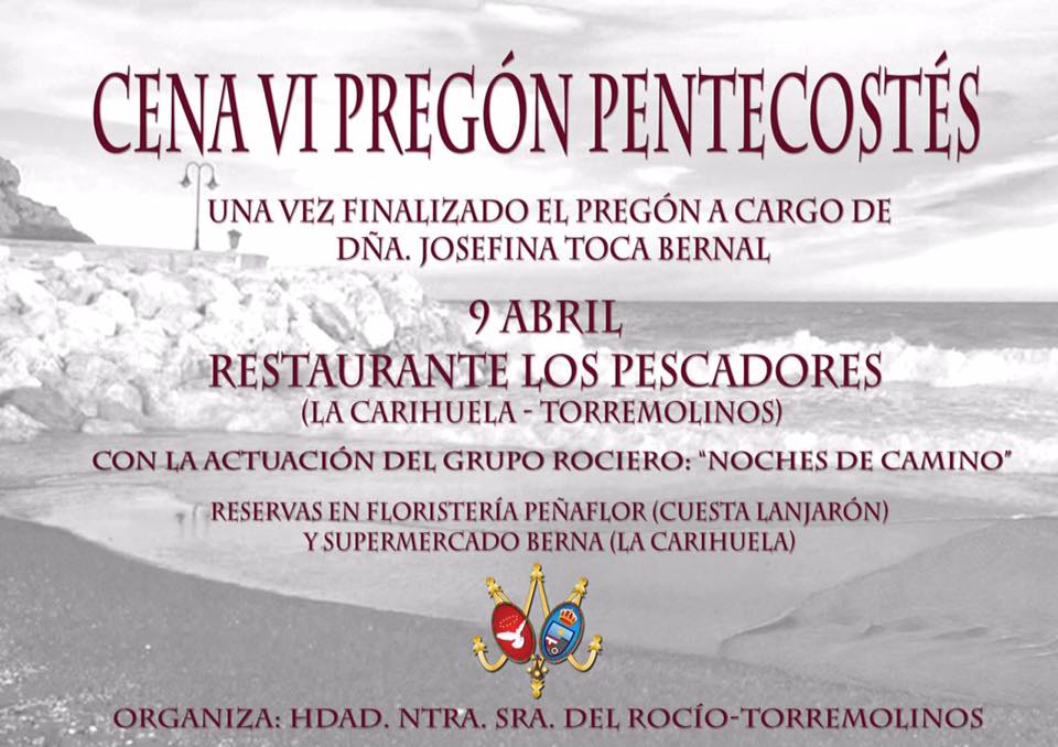 la encargada de pregonar la fiesta de Pentecostés. Dicho Pregón tendrá lugar el sábado 9 de abril, una vez que concluya la Función Principal en la Parroquia. Posterior al Pregón, la Hermandad ha organizado una cena en el Restaurante “Los Pescadores”. Todas las personas interesadas podrán acudir a esta cena, con un donativo que la Hermandad destinará a la ejecución de su Simpecado. Las entradas podrán retirarse en Supermercado Berna (Carihuela) y Floristería Peñaflor (Cuesta Lanjarón). Durante la cena, el grupo Noches de Camino, con su música nos trasladará a las noches del camino.