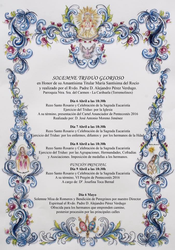 La Hermandad de Nuestra Señora del Rocío de Torremolinos se encuentra inmersa en la preparación del Triduo en Honor a su titular, la Virgen del Rocío, que se realizará por su Director Espiritual, Don Alejandro Pérez Verdugo, en la Parroquia Nuestra Señora del Carmen los días 6, 7 y 8 de abril a partir de las 19 horas, dando comienzo el Rezo del Santo Rosario a las 18:30 horas.