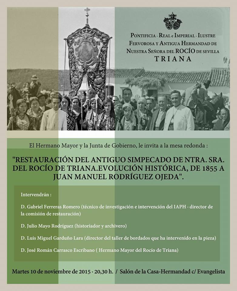 El próximo martes día 10 de noviembre, a las 20:30h, se celebrará en el salón de la Casa-Hermandad, una mesa redonda bajo el título «La restauración del Simpecado antiguo», en la que intervendrán: D. Gabriel Ferreras Romero, en calidad de técnico del Departamento de Investigación e Intervención del Instituto Andaluz de Patrimonio Histórico y Director de la Comisión de restauración, D. Julio Mayo Rodríguez, Historiador del Arte versado en la evolución histórica de la Romería del Rocío y su patrimonio y D. Luis Miguel Garduño Lara, como Director del taller de bordados donde se ha acometido la intervención, sustentando éste último su exposición, en una proyección visual.
