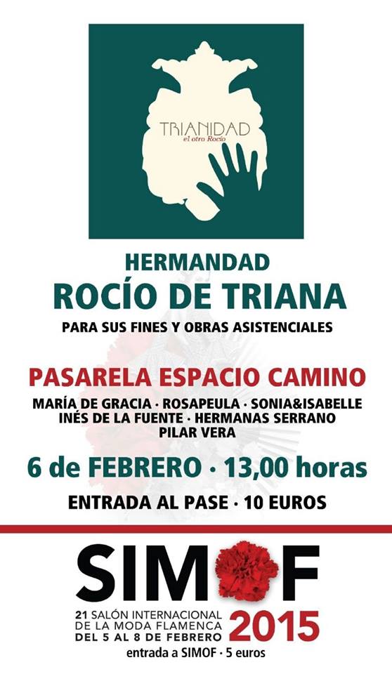 Dentro del Salón Internacional de la Moda Flamenca (SIMOF) de este año 2015, que se celebra en las instalaciones de el Palacio de Congresos y Exposiciones de Sevilla (FIBES) del 5 al 8 de febrero, nuestra Hermandad tiene dedicada a sus fines y obras asistenciales la Pasarela Espacio Camino, pase que tendrá lugar el día 6 de febrero a las 13:00 horas.