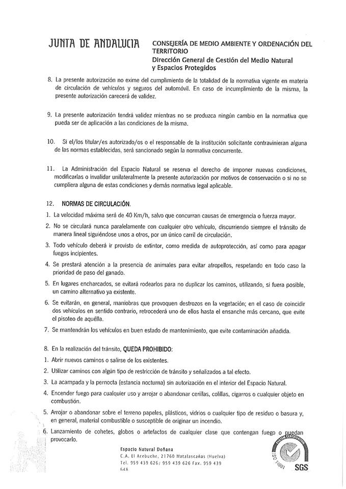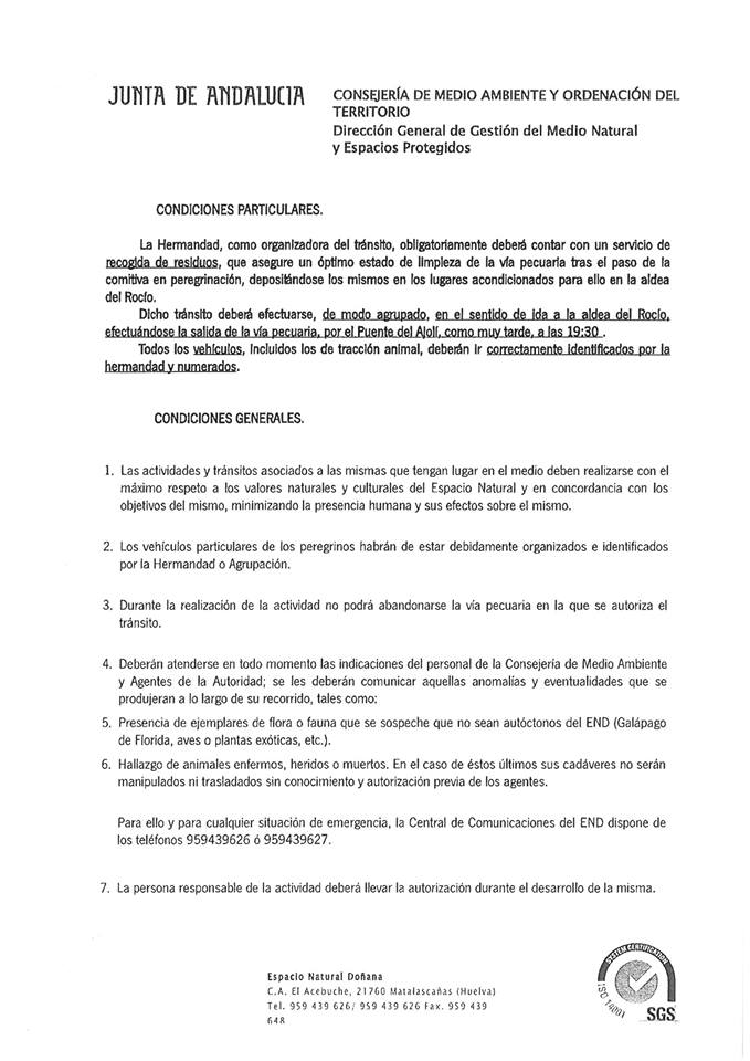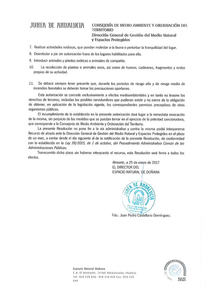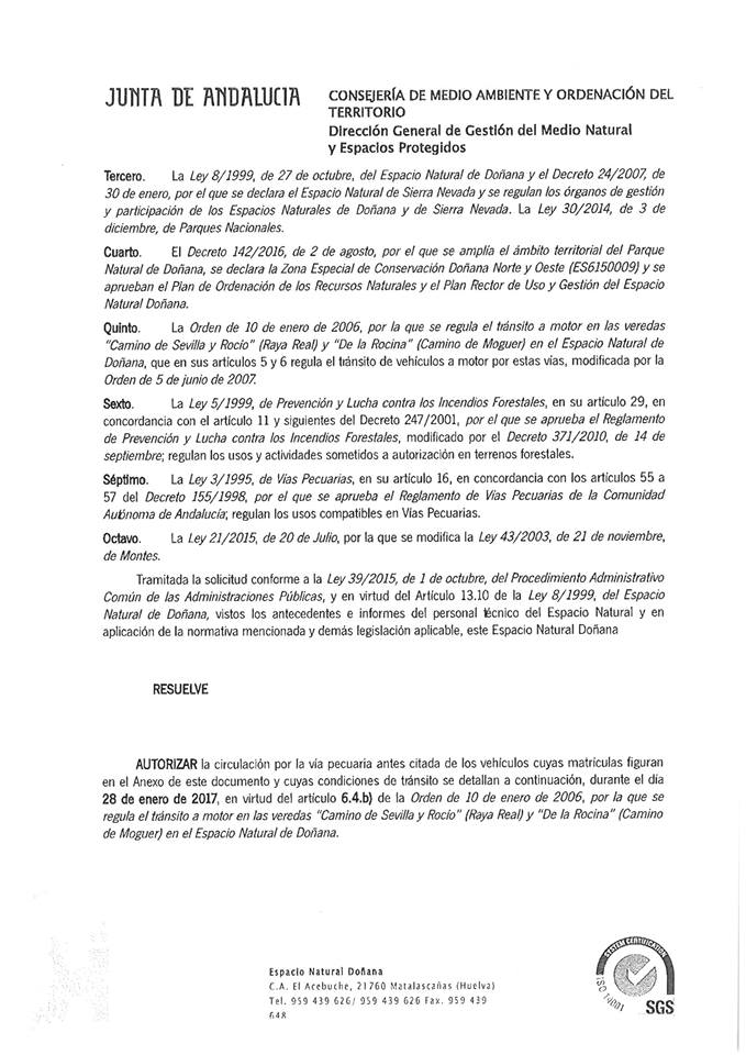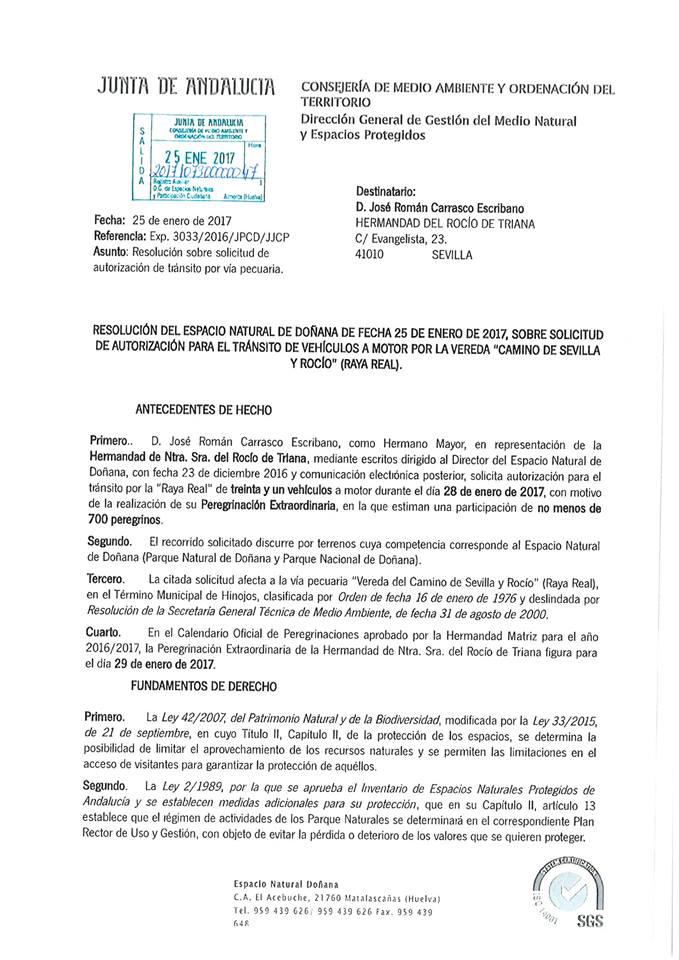 Hermandad de Triana – Resolución del espacio Natural de Doñana referente a la Peregrinación del próximo sábado 28 de enero de 2017.