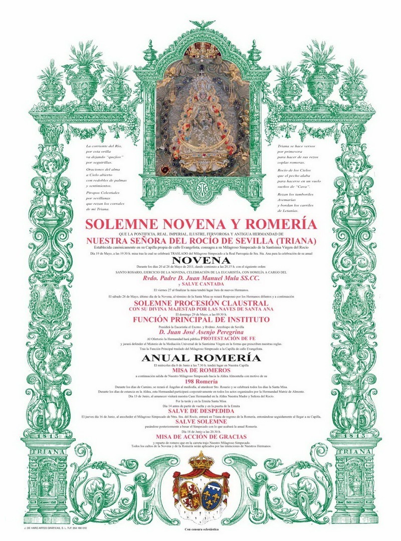 Hdad. de Triana – Solemne Novena durante los días 20 a 28 de mayo. El día 29 de mayo, a las 9,30 horas, Función Principal de Instituto.