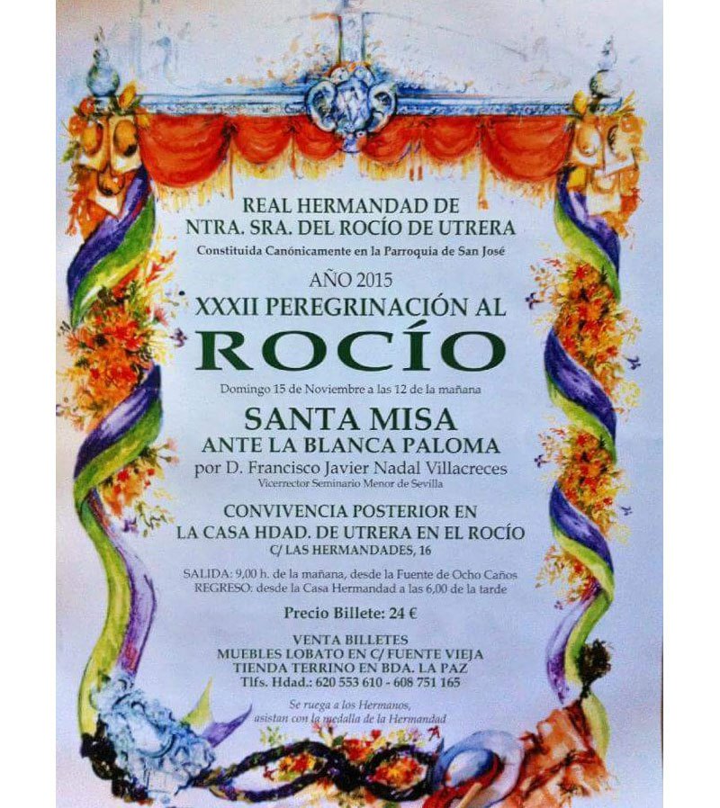 La Hermandad del Rocío de Utrera organiza una peregrinación a la Aldea de Almonte el próximo 15 de noviembre. La salida tendrá lugar a las 09.00h de la mañana en la Fuente Ocho Caños que se encuentra en la entrada de Utrera. El regreso tendrá lugar a eso de las 18.00h desde la casa Hermandad de la Aldea de Almonte.
