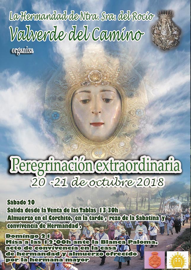 Los días 20-21 de octubre la Hermandad celebra su peregrinación extraordinaria que como es habitual tendrá su salida el sábado 20 desde la Venta de las Tablas sobre las 13’30h, almuerzo en el pinar del Corchito (Bonares) y convivencia de hermandad en dicho pinar, donde se rezará la Sabatina a la Virgen del Rocío a la caída de la tarde, la convivencia continuara por las arenas y no hay hora de llegada a la aldea dado que la Hermandad no tiene compromisos ese día.